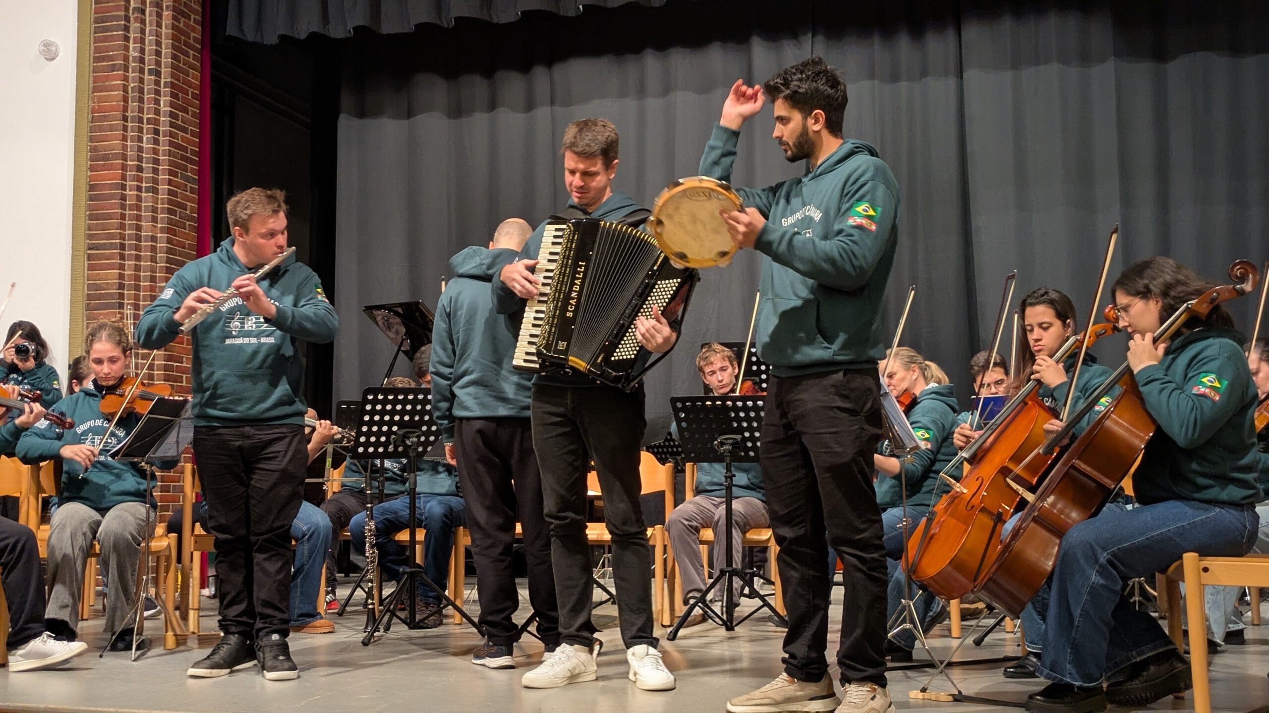 Das besonders temperamentvolle Spiel der vier brasilianischen SolistInnen an der Klarinette, Querflöte, dem Akkordeon und dem Tambourin faszinierte die Schülerinnen und Schüler, hatten sie beispielsweise ein Tambourin noch nie derartig wirkungsstark mit fingerfertigem und rhythmisch versiertem Spiel im Einsatz gesehen. Klein, aber oho.