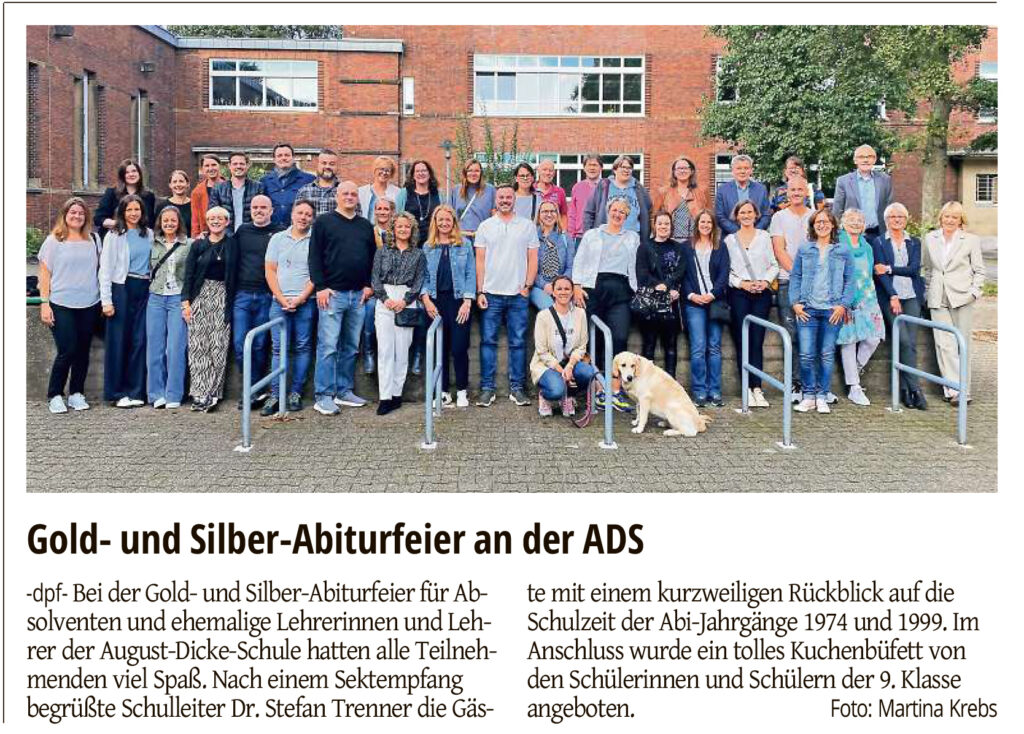 Die Feier des Gold- und Silberabiturs (Jahrgänge 1975 und 2000) findet am Samstag, den 20.09.2025 in der ADS statt. Um 15 Uhr gibt es einen Sektempfang in der Mensa (früher Essraum) im Neubau mit anschließendem Kaffeetrinken. Wer mag, kann auch an einer Schulführung teilnehmen. Anmeldungen nimmt das Schulbüro gerne per E-Mail entgegen (gy-august-dicke@solingen.de).