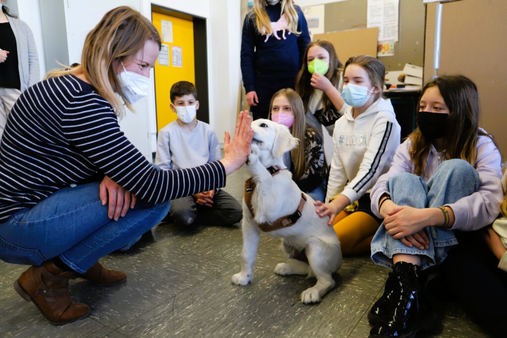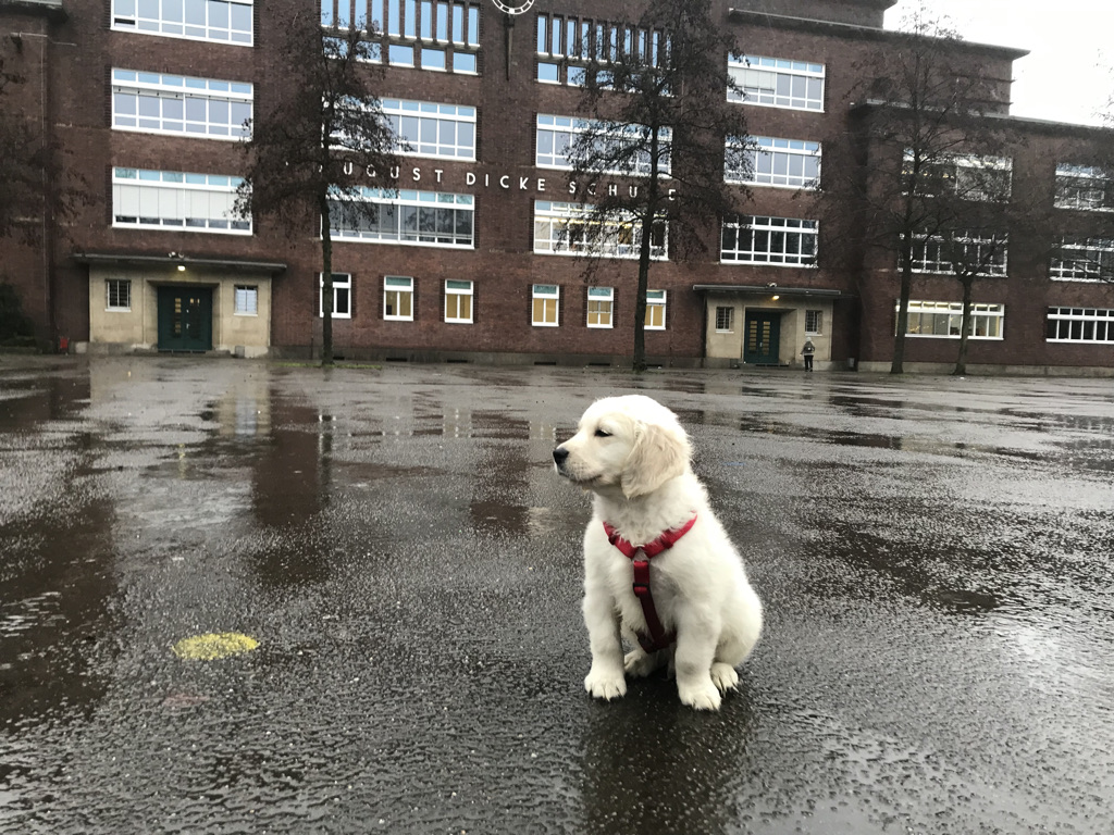 Nach den erfolgreich bestandenen Theorieprüfungen durften Willi und Cookie ihre ersten Erfahrungen in der Schule und mit allen Beteiligten vor Ort sammeln. An ausgewählten Tagen begleiten sie nun Frau Schöwe & Frau Kobeloer in einzelnen Unterrichtsstunden und übernehmen, je nach Alter und Ausbildungsstand, auch aktive Phasen im Unterricht.